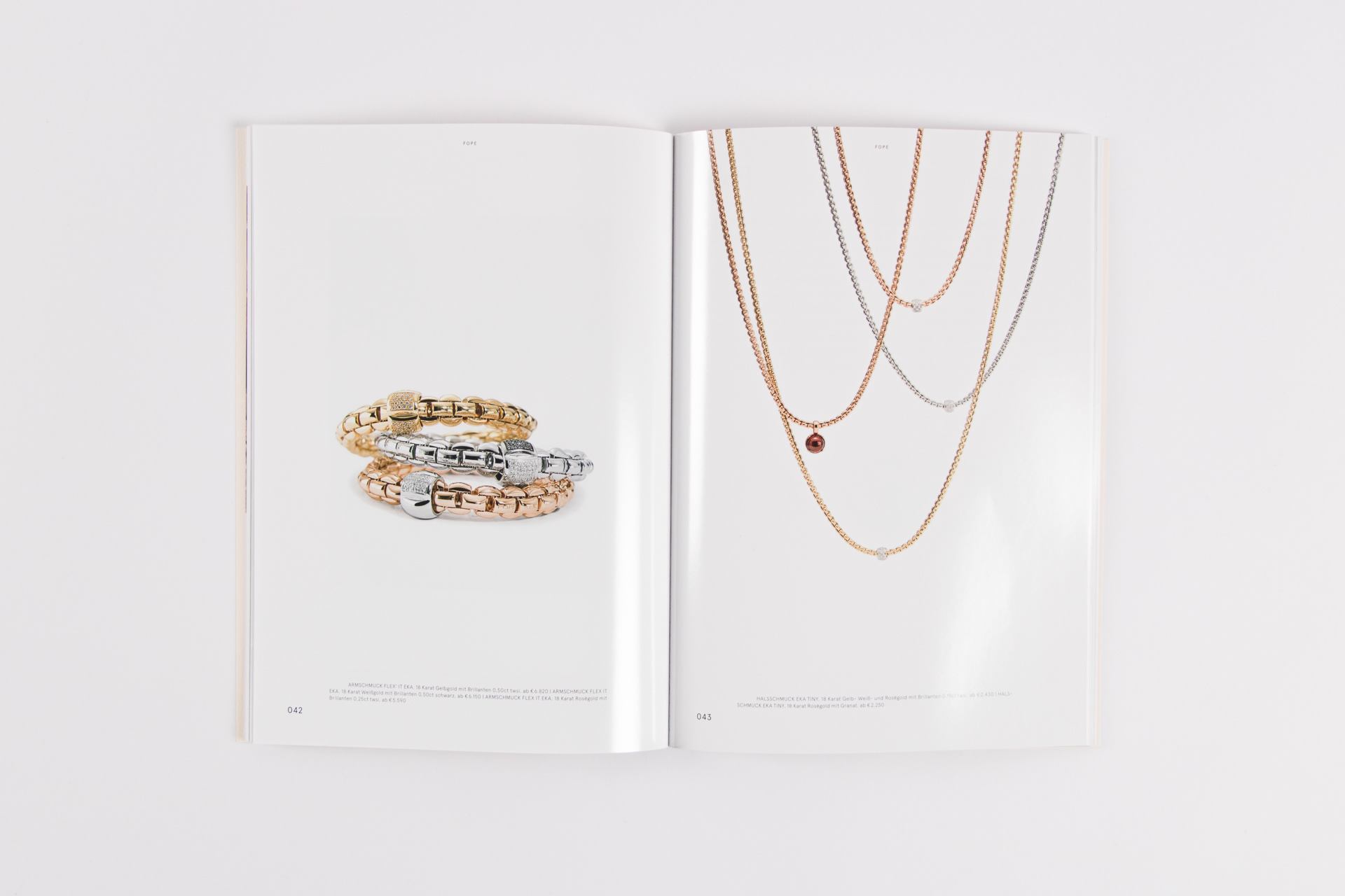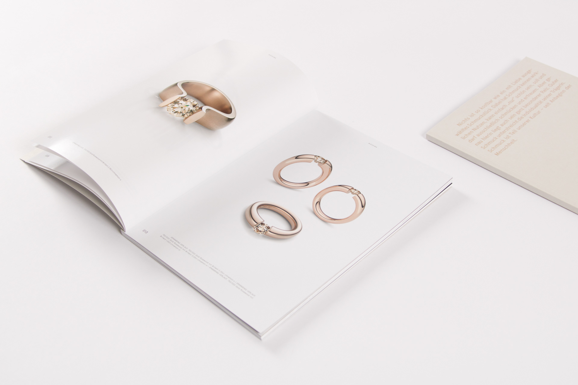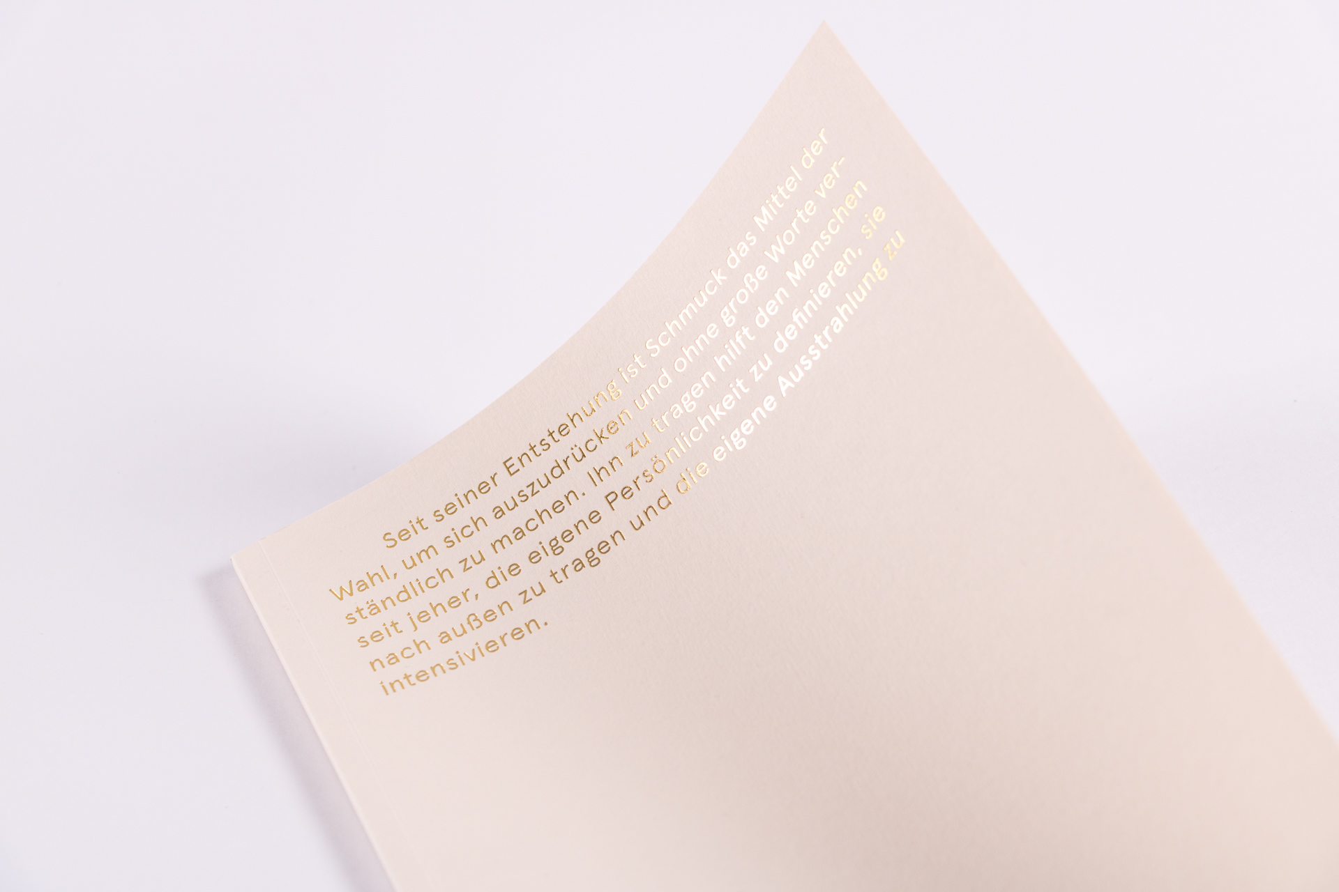 Nothing is as precious as a piece of jewelry – chosen with love. Jewelery has no real use, can only be 'beautiful' – should exclusively adorn and delight. " This is the motto of the gallery of jewelery, which is characterized by its beautiful jewelery by world-famous designers. We have given the content the appropriate framework so that the understanding of jewelery of the gallery is even clearer. Clear shape language, a characteristic typography and a high-quality paper selection, as well as finishing the cover complete the design.