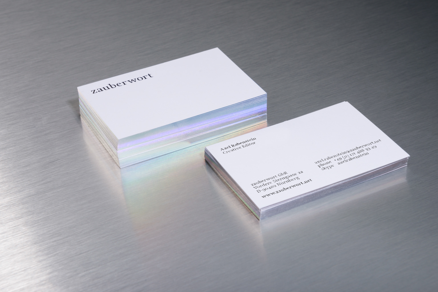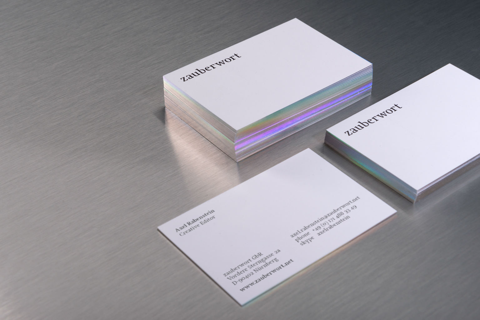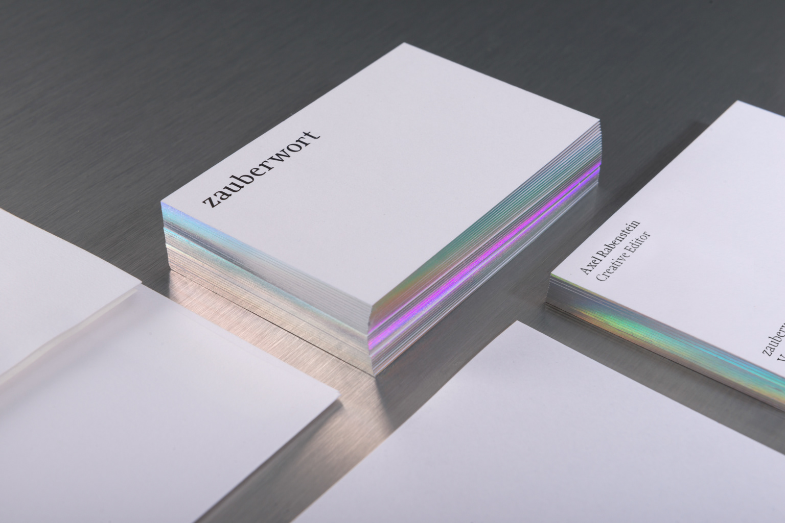 Zauberwort is a free office for conception, text-design and text editing. The textual allround skills of the office was given a new look by FYFF. A clear and timeless, yet distinctive word mark is the focus in the corporate design. The colors white and black are inspired by the classic tools of a lyricist: pen and paper. Especially "charming" are the business cards that pick up the playful spirit of the name, in form of foiled edges with an iridescent hot foil.